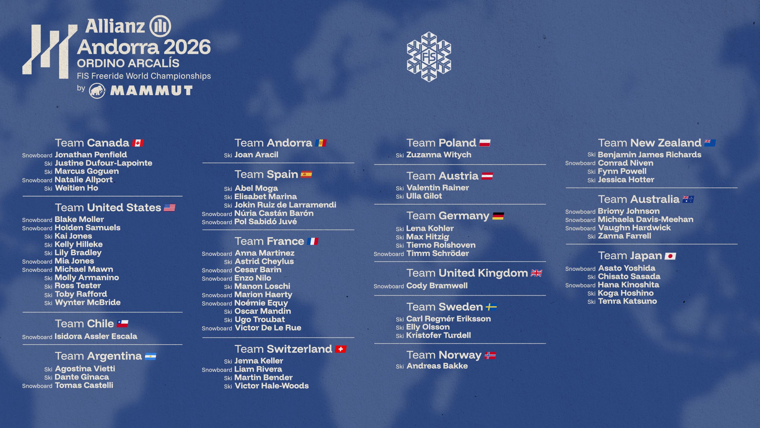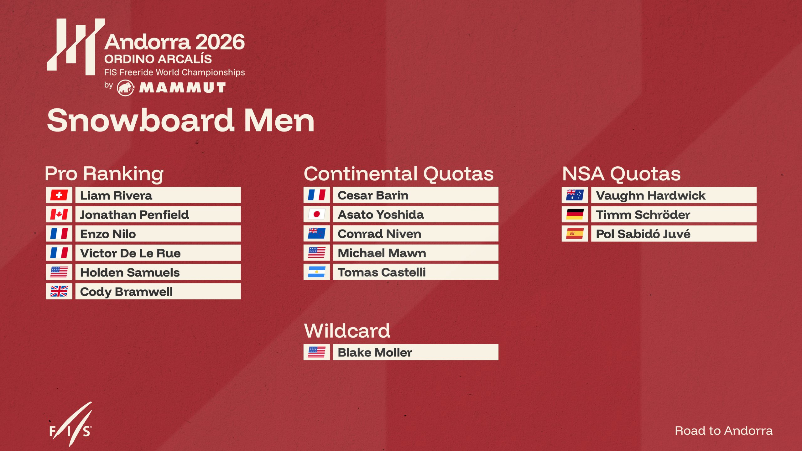 “The top-ranked riders from the 2025 FIS Freeride World Tour Pro standings earned direct qualification for the World Championships. All Group 1 athletes meet the official FIS eligibility criteria and were invited by FIS following the conclusion of the 2025 season. Should any athlete be unable to participate, their National Ski Association (NSA) is responsible for selecting a replacement within the same competition category.” – FWT