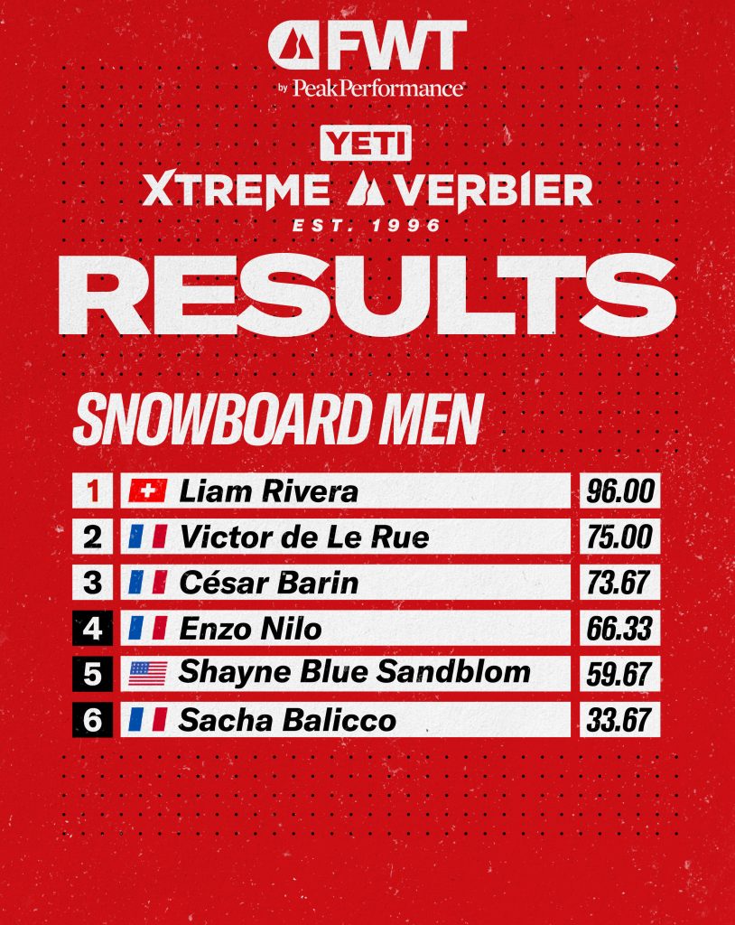 “It’s a competition I’ve watched since I was a kid, and winning it feels unreal. I’m so happy to have put down my run and deliver a show in front of my family and the Swiss crowd.” — Liam Rivera, 2026 YETI Xtreme Verbier Snowboard Men Winner