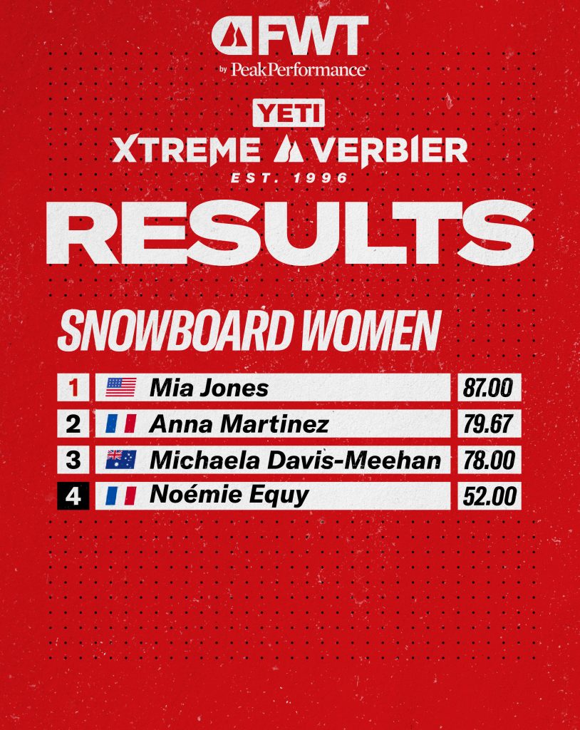 “I can’t believe it. I was pretty nervous riding the Bec for the first time, but in these conditions, the venue was just incredible. There was so much energy at the top, with everyone cheering, it was an unforgettable moment.” — Mia Jones, 2026 YETI Xtreme Verbier Snowboard Women Winner and 2026 FWT Snowboard Women Champion